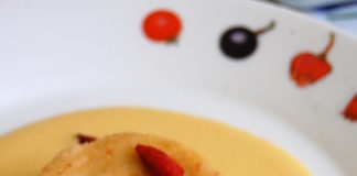 Budino di cipolle su crema al parmigiano e zafferano e bacche...
