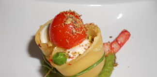 Paccheri ripieni di mousse ai gamberi rossi e ricotta, su letto...
