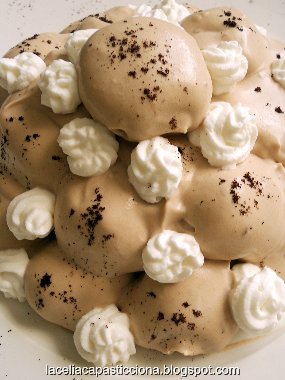Riempire i bignè con la panna montata zuccherata. Unire in una ciotola il preparato al caffè con la crema bianca. Mescolare per bene e aggiungere il resto della panna montata e amalgamare il tutto. Tuffare i bignè nella crema al caffè. Prendere con le mani ciascun bignè dentro la ciotola e ricoprirlo di crema in modo da avere una superficie liscia di copertura. Adagiare i bignè sul piatto dove realizzare la piramide di profiteroles. Guarnire con fiocchi di panna montata e polvere di caffè. Lasciare riposare in frigo più possibile, io l’ho lasciato in frigo 4 ore. Buon appetito!