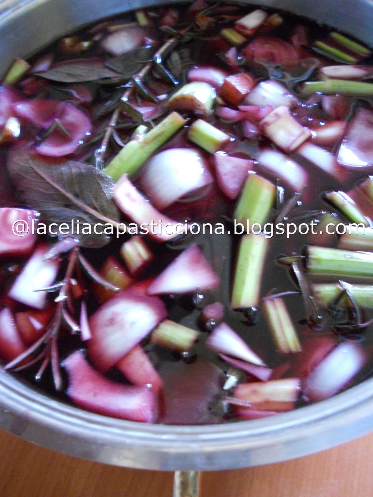 Legate la carne con spago; lavare, mondare e tagliare grossolanamente le verdure. In una ciotola capiente mettere sia la carne che il misto di verdure con tutte le spezie e l’aglio pelato e intero. La quantità di vino da usare varia perché se ne deve aggiungere fin tanto che il tutto non è coperto. Coprire con un coperchio o con pellicola trasparente e lasciare macerare per 15 ore.