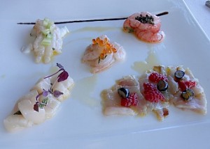 Poi ancora il piatto dei crudi di mare con guarnizioni di frutti di bosco, uova di salmone e coulis al limone. Altra eccellente trovata.