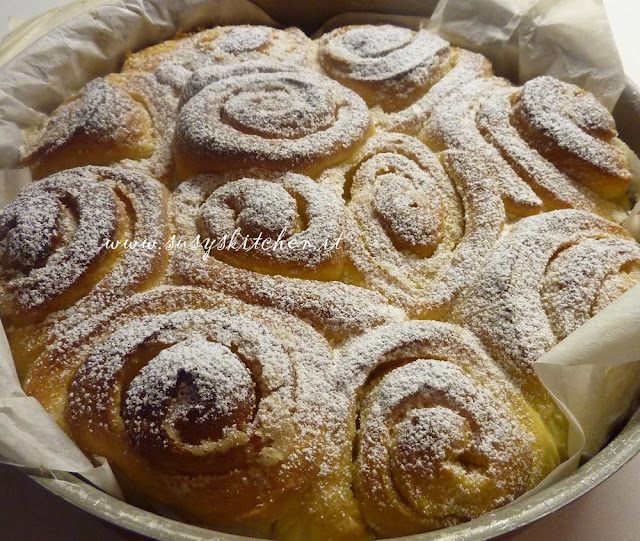 Fate rinvenire il lievito, in un po’ di latte tiepido, con un cucchiaino di zucchero e due cucchiai di farina. Lasciate riposare per 20 minuti in un luogo caldo. Dopo il tempo di riposo impastate in una terrina il resto della farina, con il lievito rinvenuto, lo zucchero, il resto del latte tiepido le uova, fino a creare un impasto abbastanza tenero e appicoso. Coprite con un po’ di pellicola e lasciate lievitare un paio d’ore o più. Dopo il tempo di riposo, stendete l’impasto fino a fermare un rettangolo (circa), molto grande. Nel frattempo mescolate il burro che avrete tenuto a temperatura ambiente o scaldato appena al microonde, (dovrà essere appena morbido) con 100 gr di zucchero a velo. Stendete la crema che avete ottenuto sul rettangolo fino a coprirlo con uno strato di qualche millimetro. Arrotolate il rettangolo partendo dal lato lungo, fino a formare un cilindro abbastanza grosso.