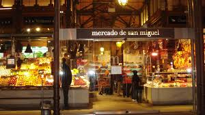 There is a sign, Mercado de San Miguel, and the bottom floor has a large window full of fruits, vegetables, fish, bread. A place to get together and walk, first of all. Here it looks like you can go shopping every day and taste something in the several shops and store houses.
