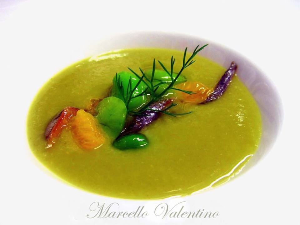 Bollire le fave in abbondante acqua salata per circa 12 minuti. Dopodiché scolarle e trasferirle in acqua e ghiaccio, attendere che si raffreddino e sbaccellarle ricordandosi di metterne da parte qualcuna per la decorazione del piatto finito. In un cilindro da cucina, frullare le fave con parte della loro acqua di cottura (anch’essa fredda), aggiungendo un filo di olio extravergine e un ciuffetto di finocchietto fresco (le parti più tenere). Dopo circa un minuto, si otterrà una vera e propria vellutata, liscia e priva di grumi. Successivamente, pelare l’arancia a vivo, ricavando da ogni spicchio la polpa e marinarla per circa 30 minuti in 3 cucchiai di olio, 1 pizzico di sale e 1 pizzico di pepe nero. In un tegame, riscaldare la vellutata e servirla su una fondina insieme a un po’ di arancia marinata, qualche fava sbaccellata, una strisciolina di pesce azzurro affumicato, un ciuffo di finocchietto e un filo di olio extravergine di oliva.